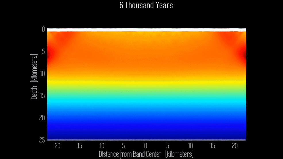 This animation demonstrates how deformation in the icy surface of Europa could transport subsurface ocean water to the moon’s surface. This is just one of several simulated behaviors reported in a new study performed by scientists at NASA’s Jet Propulsion Laboratory. The study focused on linear features called “bands” and “groove lanes” found on Jupiter’s moons Europa and Ganymede. Scientists have used the same numerical model to solve mysteries about motion in Earth’s crust. The animation is a two-dimensional simulation of a possible cross-section of a band running through Europa’s ice shell. At the extreme bottom is Europa’s ocean, and the thick white line across the top represents the moon’s surface ice. The midsection is the bulk of Europa’s ice shell, with warmer colors (red, orange, yellow) representing stronger, more rigid ice. Depth is marked on the left side of the animation while numbers on the bottom measure distance from the center of the band feature on Europa’s surface. Bands on Europa and Ganymede are typically tens of miles wide and hundreds of miles long. Numbers at the top mark the passage of time in thousands of years. As the animation runs forward, the ice shell is deformed by gravitational interactions with Jupiter. The cold, brittle ice at the surface gets pulled apart. At the same time, faults in the upper ice form, heal, and re-form (visible as diagonal yellow, green and blue lines in the upper center of the animation). The churning material that quickly fills the bottom half of the view is a collection of tiny white dots representing bits of Europa’s ocean that have been frozen into the bottom of Europa’s ice shell (i.e. where the liquid ocean is in contact with the frozen shell). In the paper, the scientists describe it as “fossil” ocean material because the bits of ocean trapped in Europa’s ice shell spend many hundreds of thousands, if not millions, of years being carried to the surface. In other words, by the time the ocean material reaches Europa’s surface where it can be analyzed by a passing spacecraft, it no longer serves as a sample of Europa’s ocean as it is in the present. Instead, the spacecraft would actually be studying Europa’s ocean as it was a million or more years ago. Hence, it is fossil ocean material. NASA’s Europa Clipper spacecraft is intended to launch in the early 2020s. The spacecraft will then orbit Jupiter and become the first spacecraft to study Europa exclusively, including the composition of the moon’s surface material. The mission will likely be able to test the model simulated above by using ice-penetrating radar to probe the moon’s bands. If Europa indeed behaves the way the simulation suggests, it might carry ocean material to the moon’s surface, where Europa Clipper would analyze it remotely using the spacecraft’s infrared and ultraviolet instruments, among others. Scientists could then study the material’s composition to consider whether Europa’s ocean might be hospitable for some form of life. Gretchen McCartney Jet Propulsion Laboratory, Pasadena, Calif. 818-393-6215 gretchen.p.mccartney@jpl.nasa.gov animation credits: NASA/JPL-Caltech/Samuel M. Howell