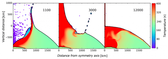 Three frame grabs from the computer simulation. The numbers in each frame are the seconds after impact. In the third frame, there is a sharp distribution of material at 0 km which the researchers say is a numerical artifact of the simulation, and not real. Image Credit: Hirata et al, 2020.