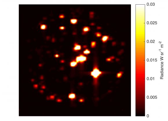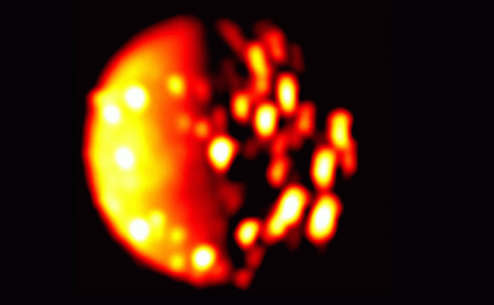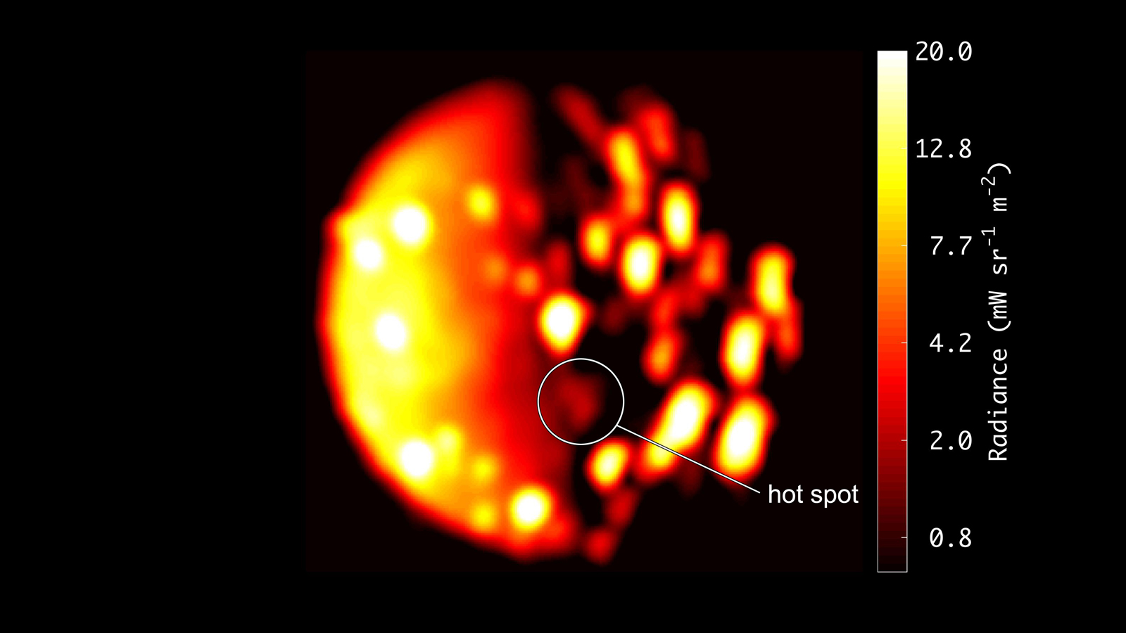 This map shows thermal emission from erupting volcanoes on Io. The larger the spot, the larger the thermal emission. Credit: NASA/JPL-Caltech/Bear Fight Institute
