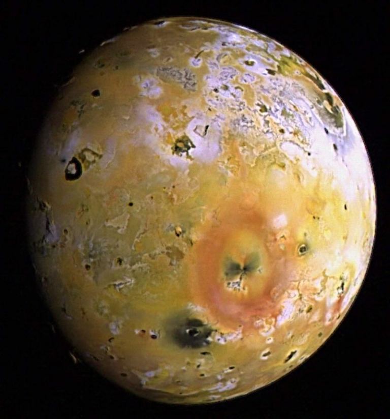 The surface of Io is covered with dark, collapsed volcanoes. Image Credit: NASA/JPL/USGS