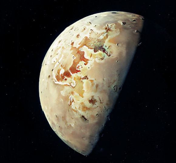 This Galileo image shows the effect Io’s extreme volcanism has on the moon’s surface. Sulphur compounds help give it a yellowish colour. Image Credit: NASA/JPL