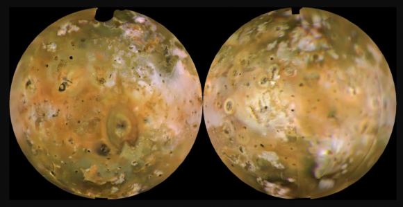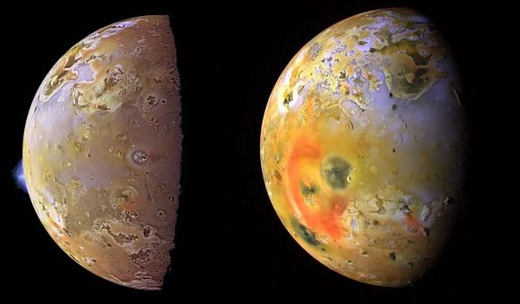 These Galileo images show two different episodes of volcanic eruptions and their plumes. The image on the left shows two plumes, one in blue on the moon’s limb, and a more difficult to see one in the center near the terminator line. The image on the right shows another eruption from Pillan Patera in 1997 as the expanding red circle with the dark spot in the center. Image Credit: (L) By NASA’s Galileo spacecraft – Public Domain. (R) NASA/JPL