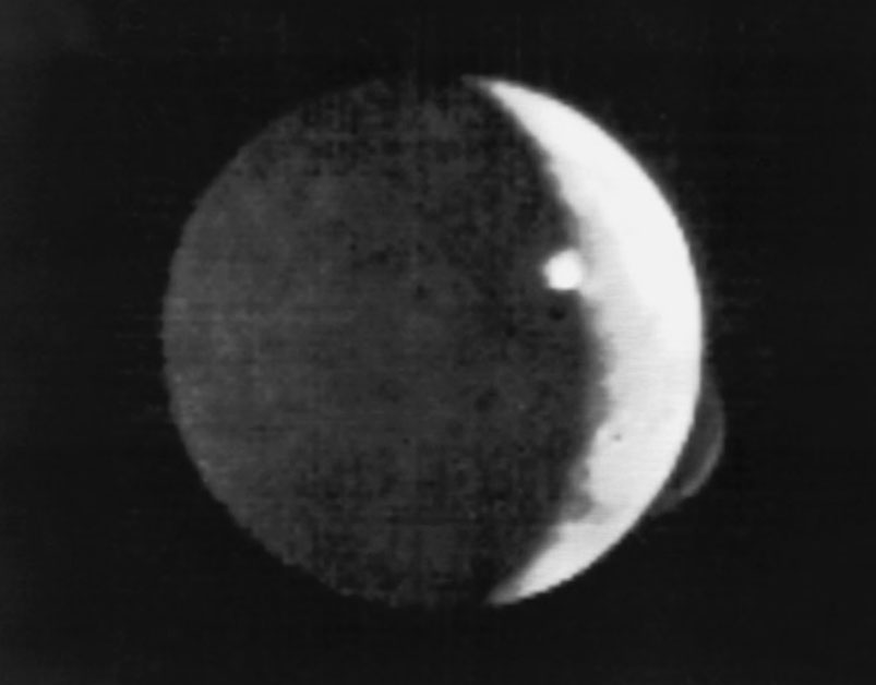 Linda Morabito spotted the puzzling plume off Io’s limb in this photo, taken on March 8, 1979, three days after Voyager 1’s encounter with Jupiter. It really does look like another moon poking out from behind Io. A second plume over the terminator (border between day and night) catches the rays of the rising Sun. Credit: NASA / JPL
