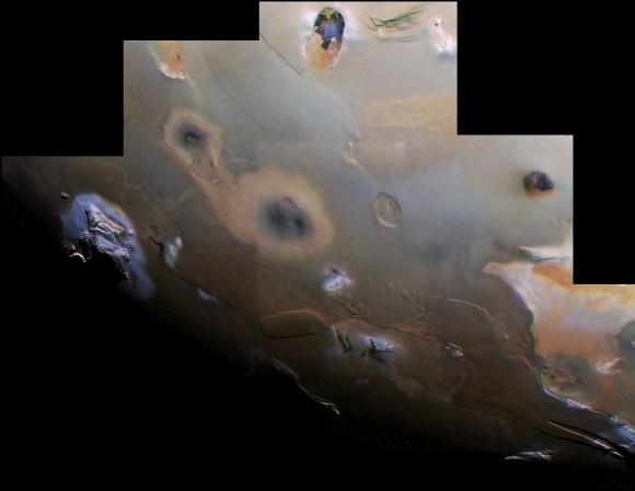 Enhanced-color Galileo image showing a dark spot produced by a major eruption at Pillan Patera in 1997. Credit: NASA/JPL