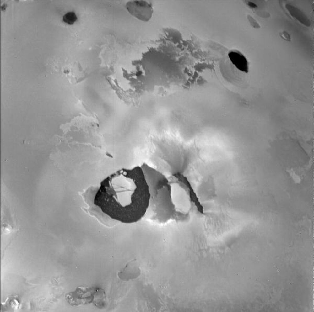 Voyager 1 image mosaic of Loki and the surrounding surface of Io, including lava flows and volcanic pits. Numerous volcanic calderas and lava flows are visible here. Loki Patera, an active lava lake, is the large shield-shaped black feature. Image Credit: By NASA/JPL/USGS – Public Domain,