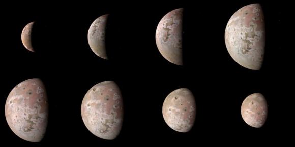 JunoCAM acquired these eight views over a period of an hour and fifteen minutes as the spacecraft approached and receded from Jupiter’s volcanic moon. These are the sharpest visible-light images of Io acquired since the New Horizons flew past Jupiter on its way to Pluto in 2007. Image Credit: NASA / SwRI / MSSS / Jason Perry © CC BY 3.0 Unported