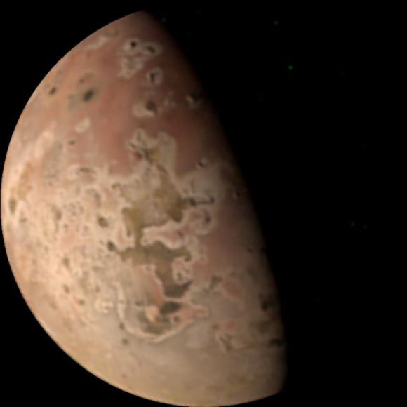 NASA’s Galileo spacecraft acquired its highest-resolution images of Jupiter’s volcanic moon Io on July 3, 1999. This colour mosaic uses the near-infrared, green and violet filters (slightly more than the visible range) of the spacecraft’s camera, processed to enhance more subtle colour variations. Most of Io’s surface has pastel colours, punctuated by black, brown, green, orange, and red areas near the active volcanic centers. Image Credit: NASA/JPL/University of Arizona
