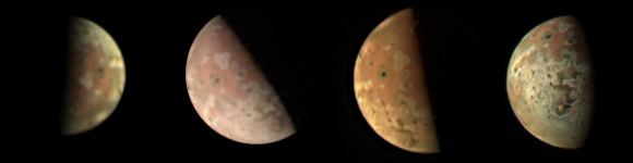 The Juno spacecraft used its JIRAM (Jovian Infrared Auroral Mapper) instrument to capture these images of Jupiter's volcanic moon Io. It captured the four images in sequence to gain different viewing angles of the moon's volcanic activity. Image Credit: NASA/JPL-Caltech/SwRI/ASI/INAF/JIRAM