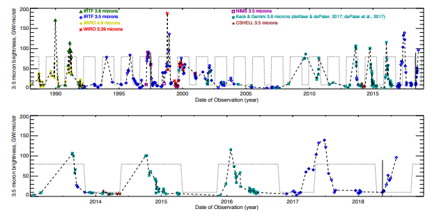 The brightness of Loki as a function of time from various sources, including the Keck and Gemini Telescopes. The upper panel shows the total available time history while the bottom is only the past 5 years. The square wave in the background is the original 540-day period. The vertical line in 2018 is mid-May 2018, indicating our prediction for when the last eruption would began. Image Credit: Rathbun et. al., 2019.