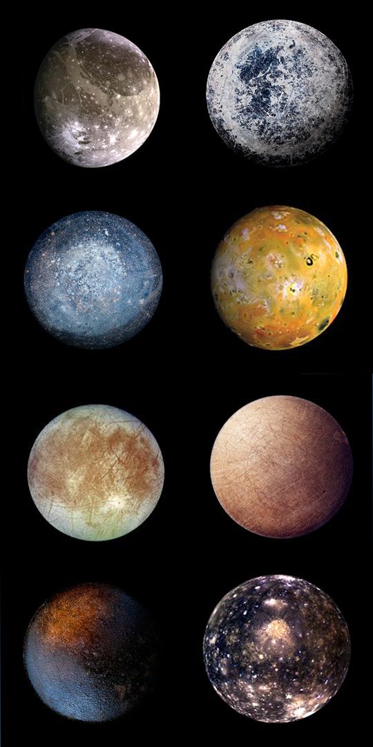 A “family portrait” of the four Galilean satellites (Io Europa, Ganymede and Callisto) around Jupiter,