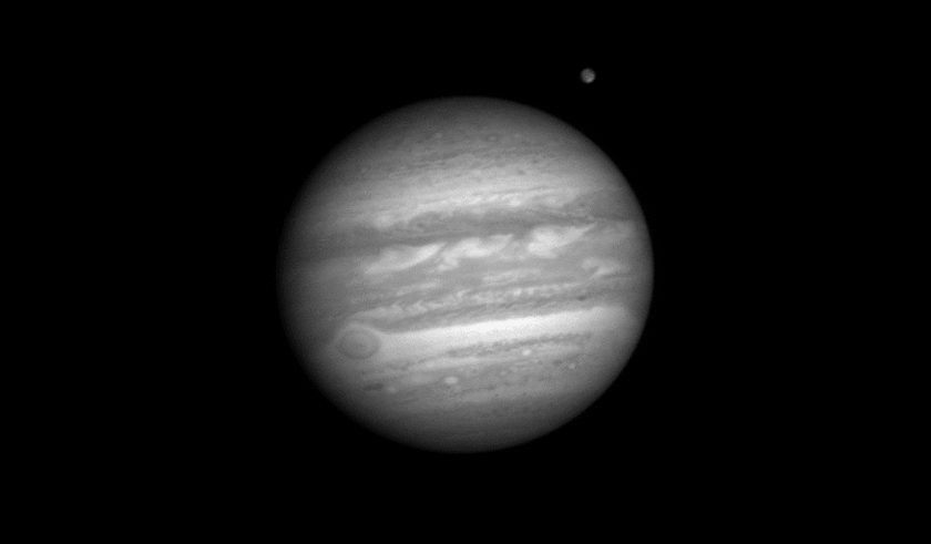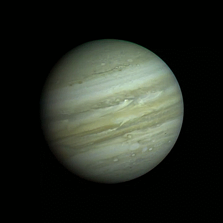 During the animation, first Ganymede and then Io cross the field of view, casting their shadows onto the planet.