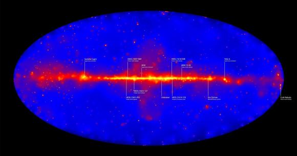 If we saw the sky in gamma rays, the same way the Fermi Space Telescope does, it would be unrecognizable. This image was constructed from six years of Fermi observations. It shows the entire sky at energies between 50 billion (GeV) and 2 trillion electron volts (TeV). The bright band in the middle is the central plane of the Milky Way. Some of the brightest sources are pulsar wind nebulae and supernova remnants within our galaxy, as well as distant galaxies called blazars powered by supermassive black holes. Labels show the highest-energy sources, all located within our galaxy and emitting gamma rays exceeding 1 TeV. Image Credit: NASA/DOE/Fermi LAT Collaboration