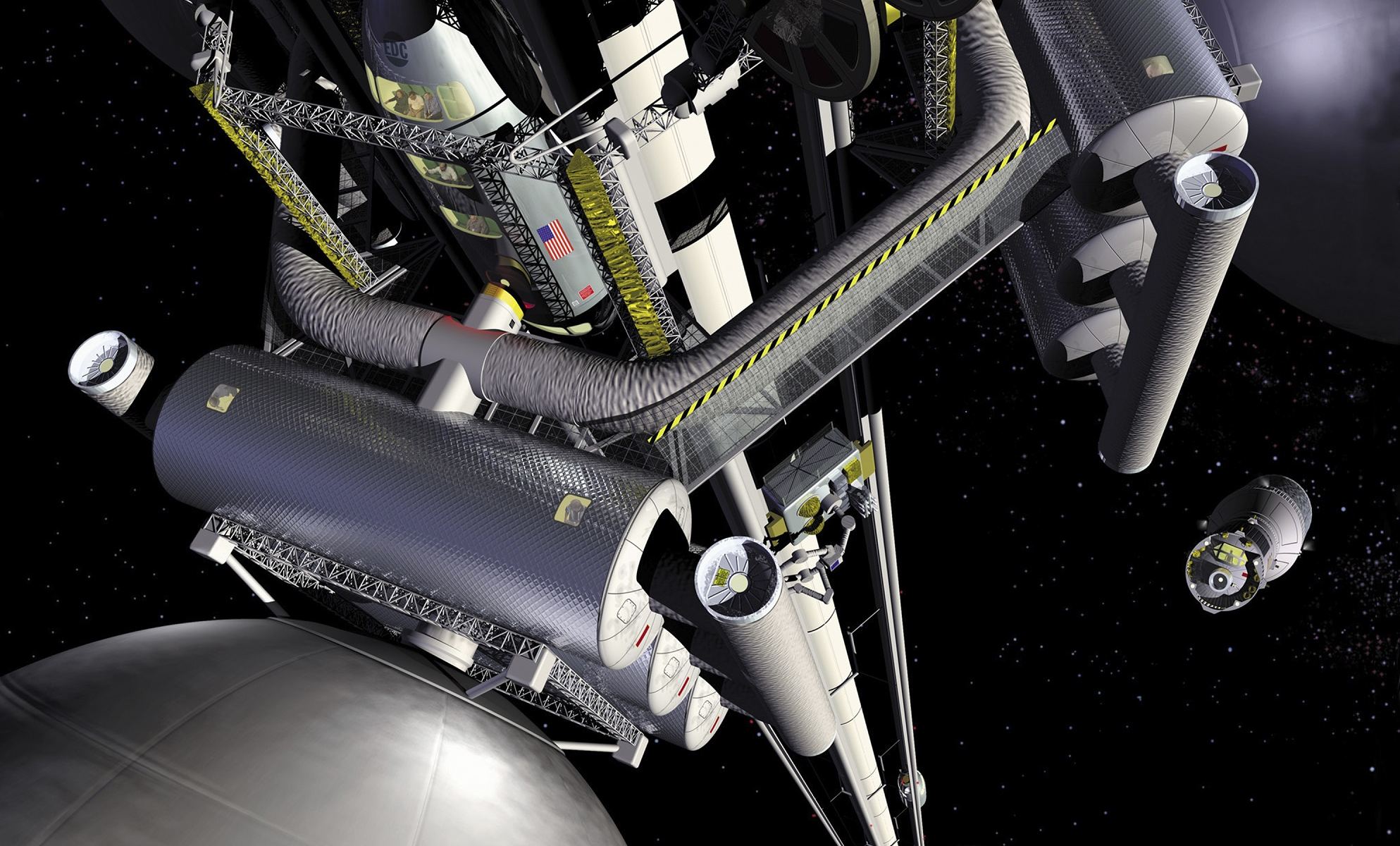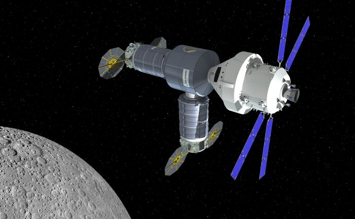 Artist rendering of Orbital ATK concept for an initial lunar habitat outpost, as it would appear with NASA’s Orion spacecraft in 2021.