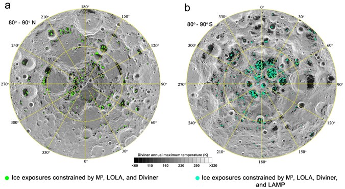 Exposed water ice (green or blue dots) in lunar polar regions and temperature. Credit: Shuai Li