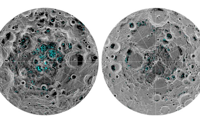 Image showing the distribution of surface ice at the Moon's south pole (left) and north pole (right), detected by NASA's Moon Mineralogy Mapper instrument. Credits: NASA