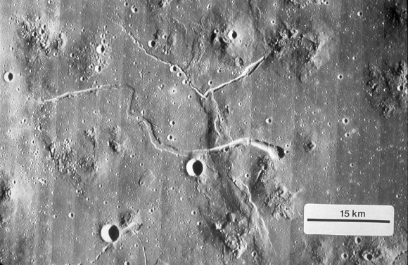 Marius Hills, which shows multiple lunar domes and two large sinuous rilles.