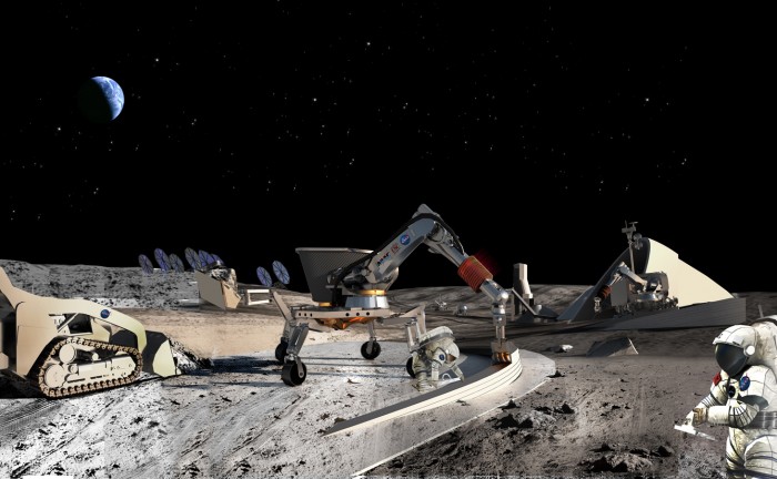 Artist’s concept for a lunar base built by construction robots and a form of 3D printing known as contour-crafting. Credit: NASA