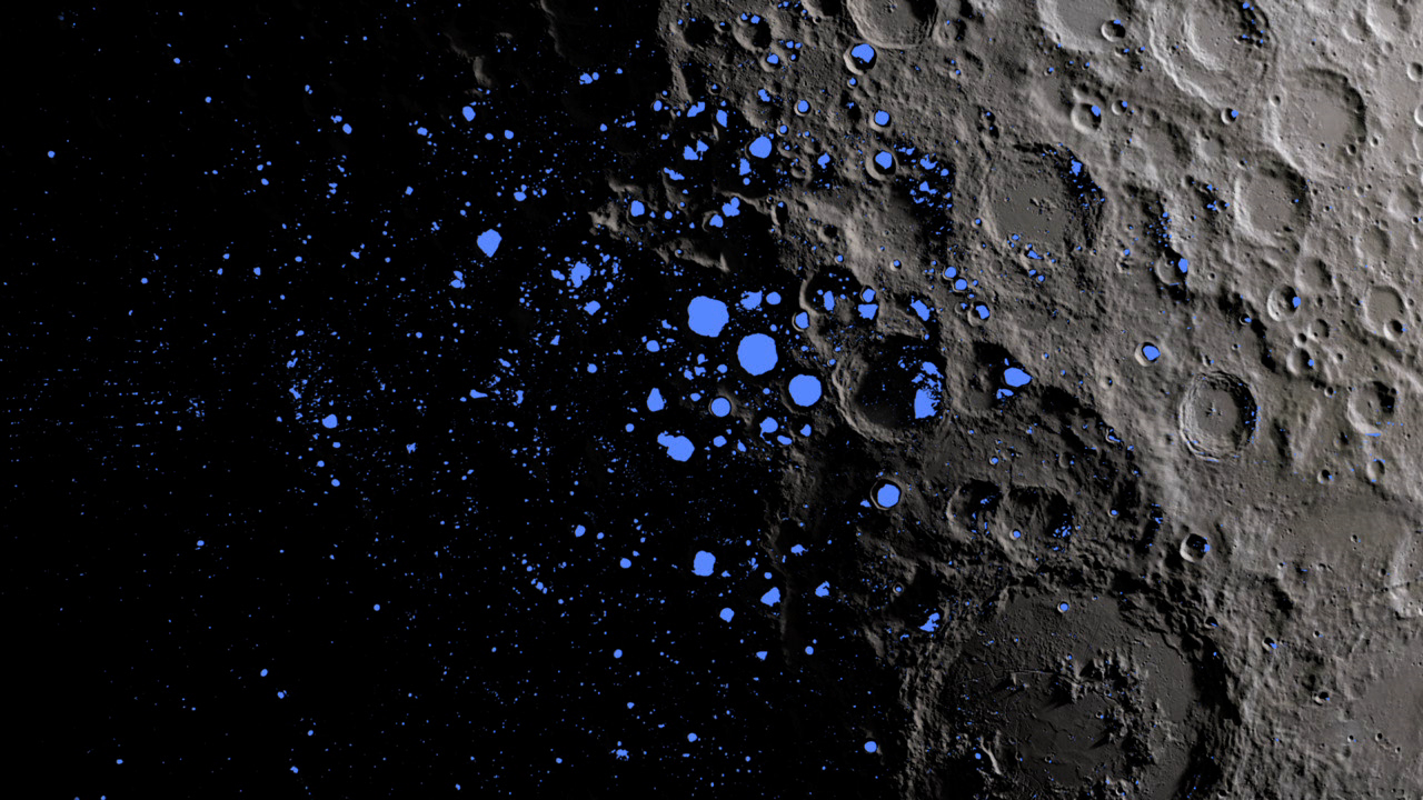A map showing the permanently shadowed regions (blue) that cover about 3 percent of the moon’s south pole. Credit: NASA Goddard/LRO mission
