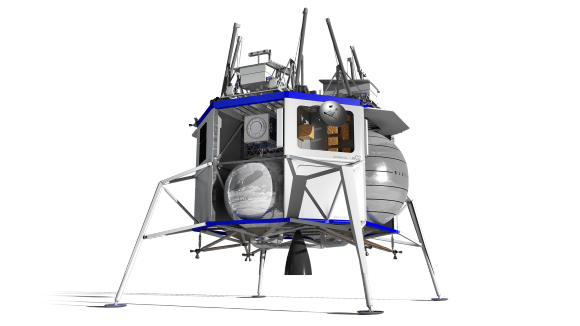 An artist’s illustration of the Blue Moon lander. On its top deck are four rovers for deployment on the surface. Image Credit: Blue Origin