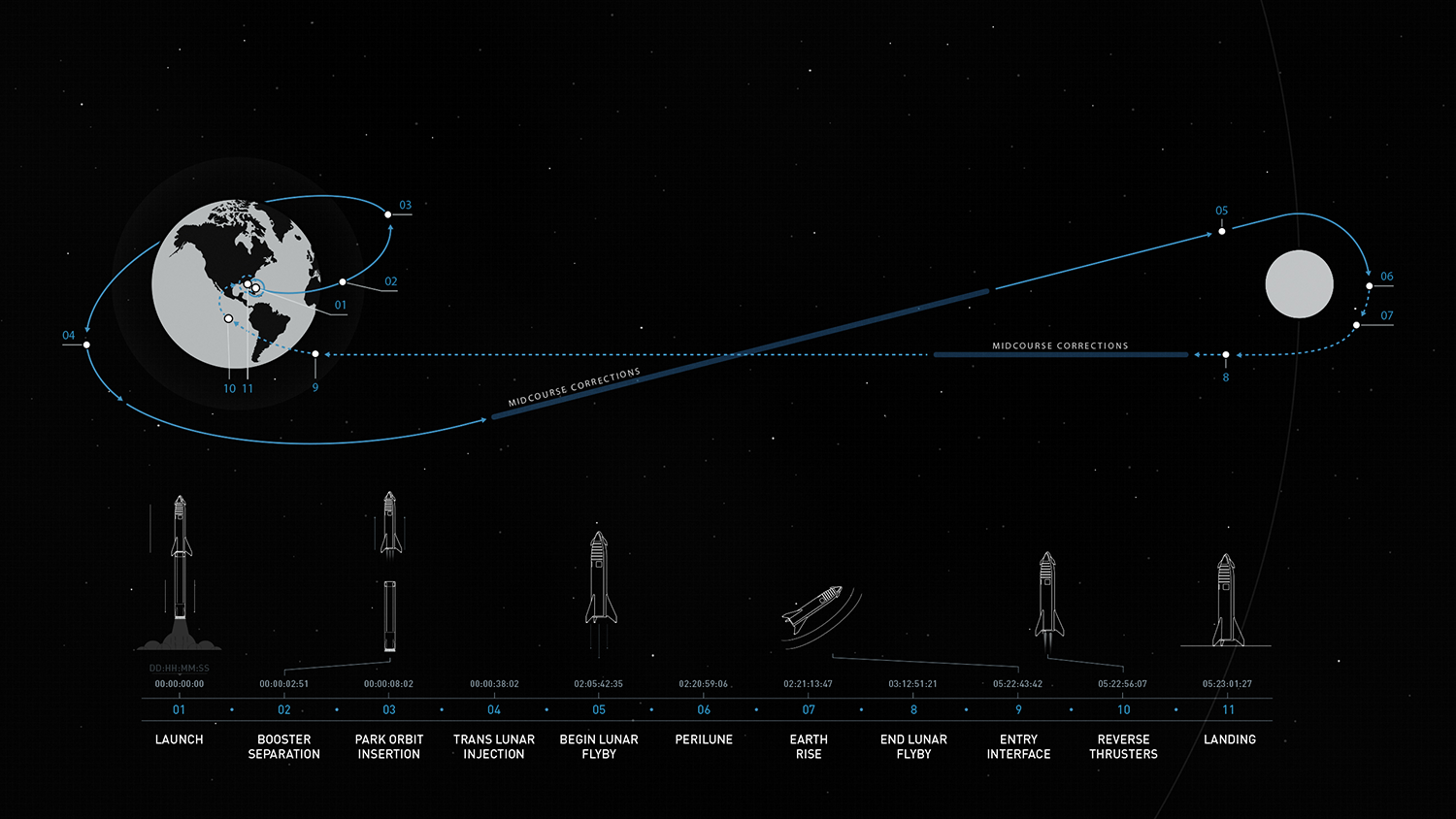 Graphic showing the various stages of the BFR’s first lunar mission. Credit: SpaceX