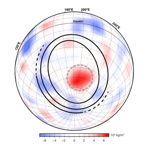 This image shows mantle mass excess per unit area. A large excess of mass in the southern interior of the South Pole-Aitken basin coincides with the central depression, outlined here with a dashed gray circle. Black lines mark the best fit ellipses for the South Pole-Aitken basin’s inner ring, outer ring, and exterior scarp. Image Credit: James et. al., 2019.