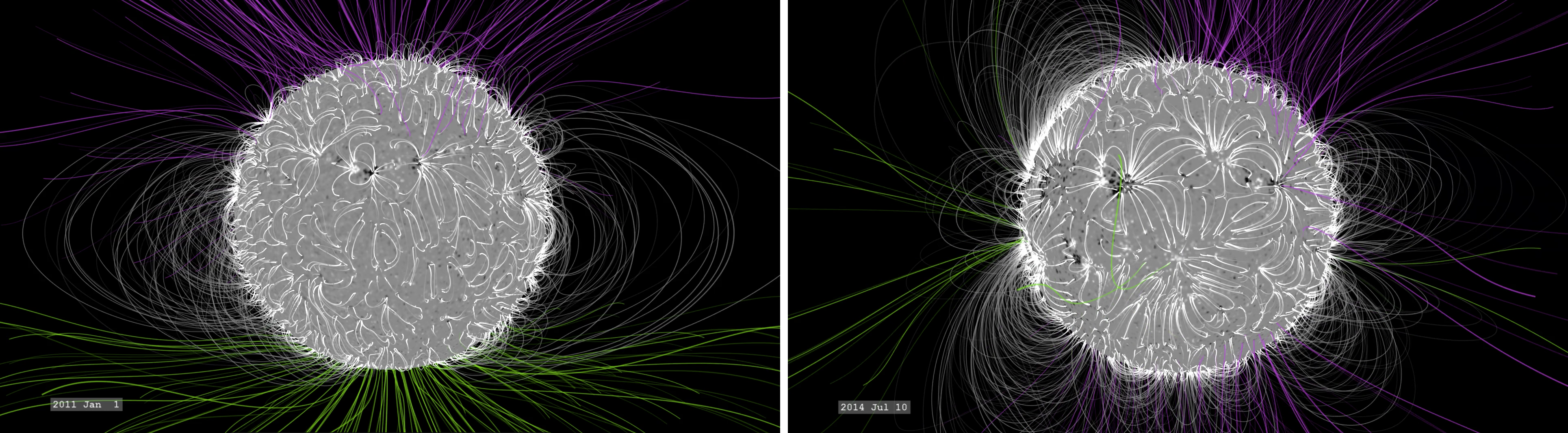 The Sun’s magnetic field varies in both strength and complexity during its 11-year cycle. This comparison shows the relative complexity of the solar magnetic field between January 2011 (left) and July 2014. In January 2011, three years after solar minimum, the field is still relatively simple, with open field lines concentrated near the poles . At solar maximum, in July 2014, the structure is much more complex, with closed and open field lines poking out all over.