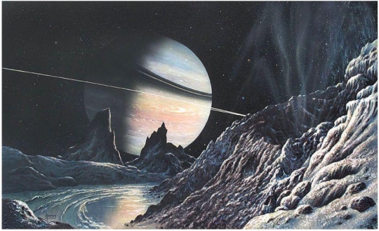 “We knew very little about the satellites in those days. Enceladus looked particularly good. It was known to have a density of .618, so it clearly had to be made of ice plus hydrocarbons, really light things; which were what you need both for biology and for propellant, so you could imagine growing your vegetables there. Five-one-thousandths g on Enceladus is a very gentle gravity, just enough so that you won’t jump off.”