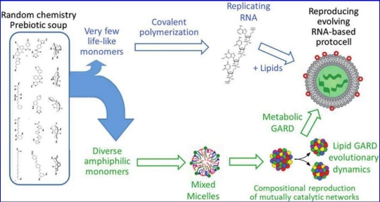 Figure 2. From soup to protocells, delineating the underpinnings of two different models, RNA First (RF, top) and Lipid First (LF, bottom). In RF, specific monomers are singled out from a heterogeneous chemical mixture and undergo polymerization, culminating in the emergence of a self-replicating polymer. This is then enclosed in a lipid bilayer, leading to protocells capable of selection and evolution. In LF, a large variety of amphiphiles spontaneously generates a plethora of assemblies, for example, micelles. The GARD model then predicts that very specific micellar compositions establish a mutually catalytic network, which may exhibit homeostatic growth. This, when followed by fission events, constitutes a reproduction system, capable of selection and evolution (see ‘‘How do lipids reproduce?’’ Section 8.4 and Lancet et al. [2018]). Subsequent prolonged evolution may lead to the emergence of RNA, proteins, and metabolism (See Section 8.5, ‘‘How would lipids beget full-fledged protocells’’ and Lancet et al. [2018] Section 11.1). Caption source: Kahana et al.