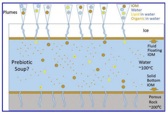 Image. Enceladus cross-section, showing the different potential components of the soup and the plumes. IOM stands for insoluble organic matter, which is taken to be synonymous with nondispersive organic matter. Such polymeric compounds can still be carried in the plume as small particles detached from insoluble organic layers at the top of the water layer. Lipid in water alludes to monomers and aggregates such as micelles and vesicles. Organic in water is dispersed, for example as a microemulsion. Inspired by the data in Postberg et al. (2018).