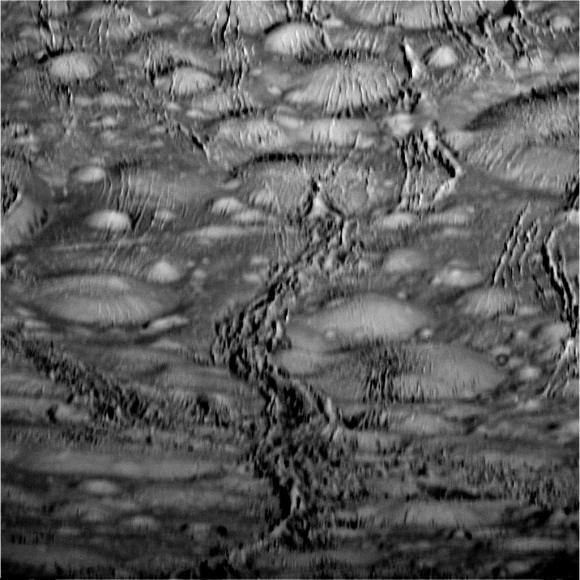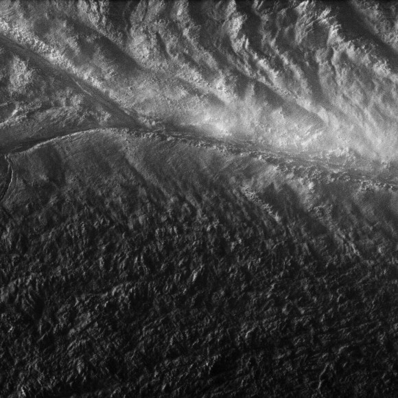 A closeup view of the icy terrain of the southern polar region of Enceladus from this weeks’ flyby.