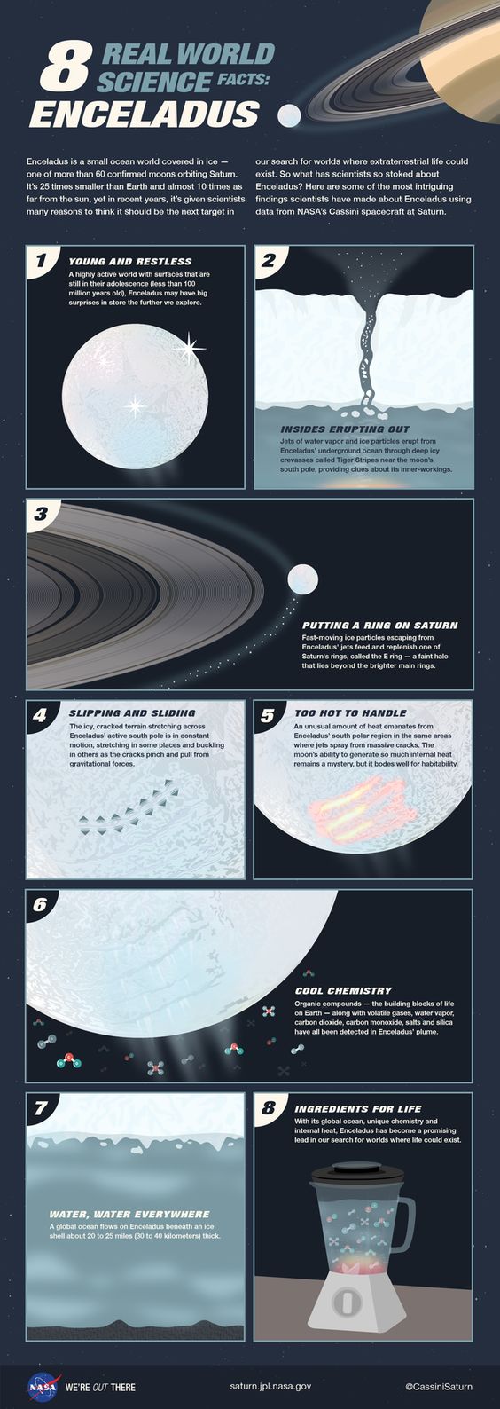 These include the jets of icy water vapor periodically bursting from its south pole, the possibility of an interior ocean �