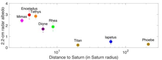 Image: This is Figure 1 from the precis of Dr. Le Gail’s presentation. Caption: Averaged 2.2-cm disk-integrated radar albedos of Saturn’s major satellites. The error bars show the dispersion of the dataset for each satellite. Credit: Alice Le Gail.