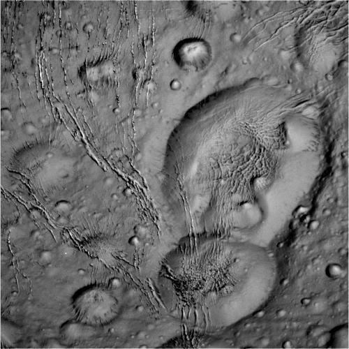 A complex region of craters and fractures near the north polar region on Saturn’s moon Enceladus.
