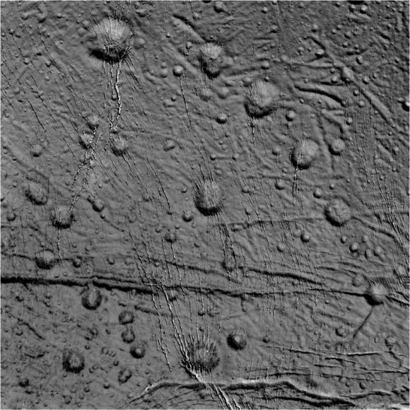 that are remarkably youthful in appearance, being generally free of large impact craters. When viewed with north pointing up, as in this image, the day-night boundary line (or terminator)