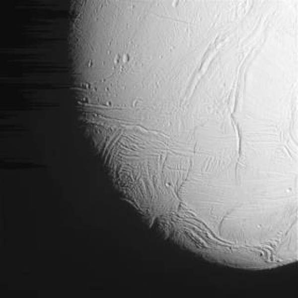 Craters and a possible straight fracture line mar the surface of Enceladus in this raw image