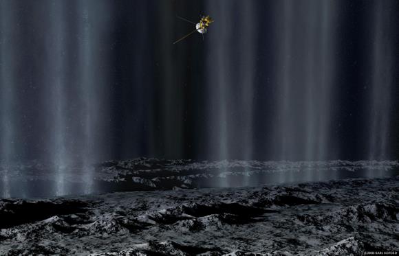 to study plumes from geysers that erupt from giant fissures in the moon�s southern polar region. Copyright 2008 Karl Kofoed/NASA.