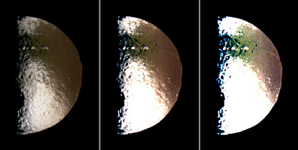 Three different false-color views of Saturn’s moon Iapetus, showing the boundary of the global “color dichotomy”.