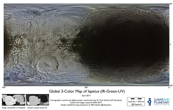 Enhanced-color map of Iapetus, using data collected by the Cassini probe. The leading hemisphere is at the right.