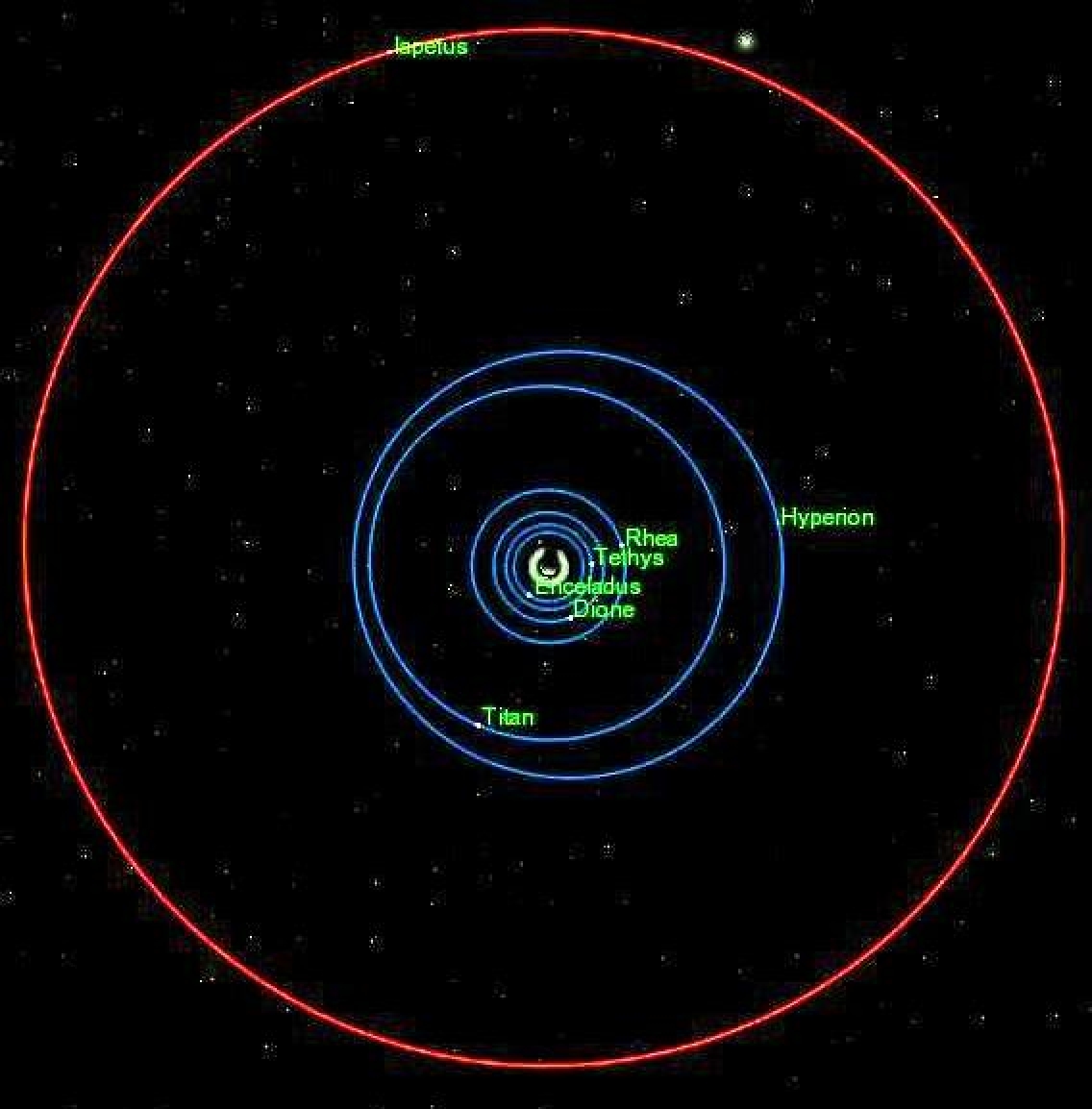 Iapetus, you see, is the outermost large moon of Saturn, orbiting twice
