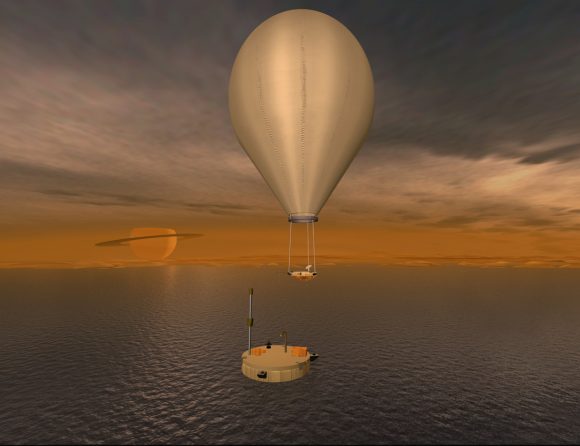 Artist’s concept of a Mongolfiere balloon and a deployable lander at Titan. Credit: NASA