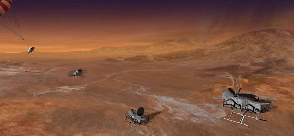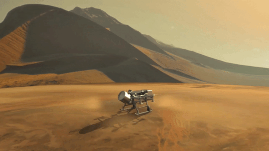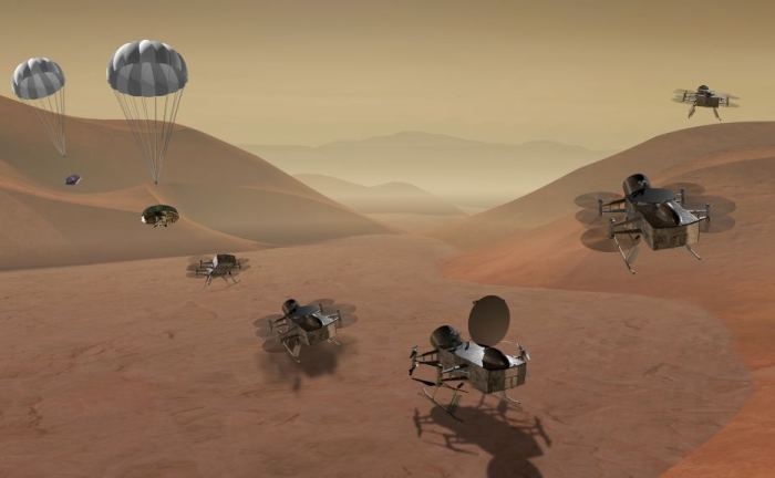 In this illustration, the Dragonfly helicopter drone is descending to the surface of Titan. Image: NASA