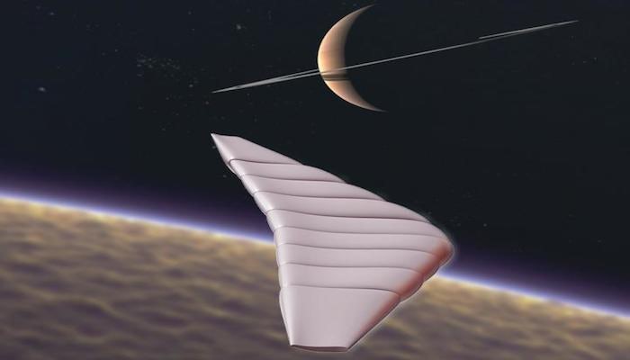 Concept for a Titan Winged Aerobot, a hybrid balloon glider that does not require significant power either to stay aloft or to achieve lateral motion. Credit: Global Aerospace Corp/Northrup Grumman