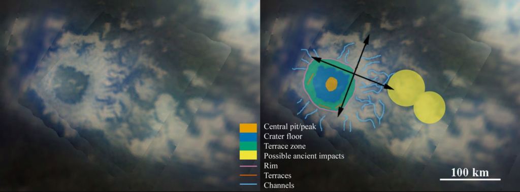 Dragonfly’s target is the Selk impact structure, near the edge of Shangri-La. Selk is a young impact crater about 90 km (56 mi) in diameter that features melt pools, sites where liquid water and organics could mix together to form amino acids or other biomolecules. Dragonfly will initially land at some dunes near the structure then begin exploring the region and its chemistry.