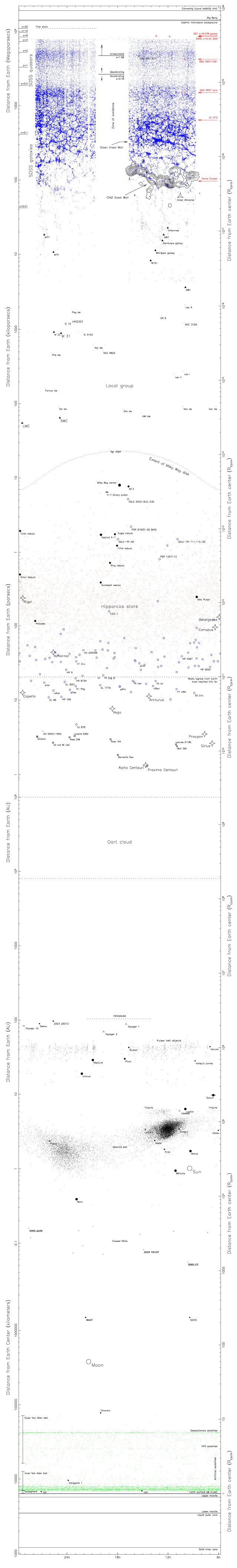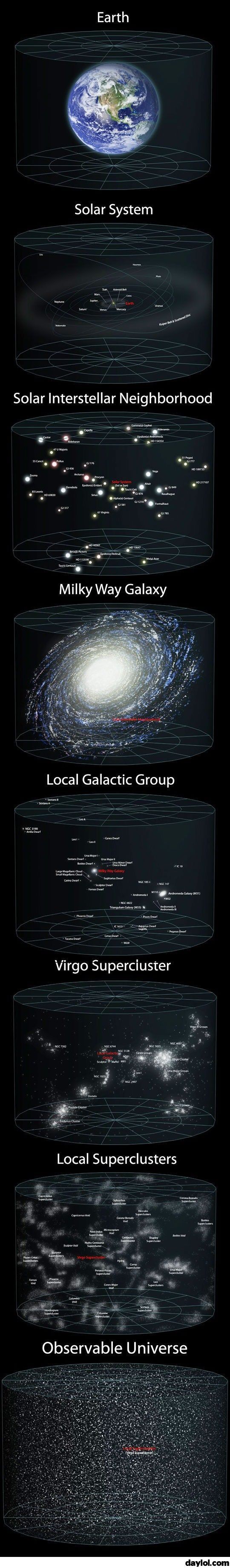 Logarithmic scheme of the observable universe with some of the notable astronomical objects known today. From left to right the celestial bodies are arranged according to their proximity to Earth. In the left border, Earth and near-Earth objects are depicted. In the right border, the most distant observed objects are depicted including GRBs, quasars, supercluster of galaxies and the cosmic microwave background radiation. Celestial bodies appear with enlarged size to appreciate their shape. By Pablo Carlos Budassi - Own work, CC BY-SA 4.0,