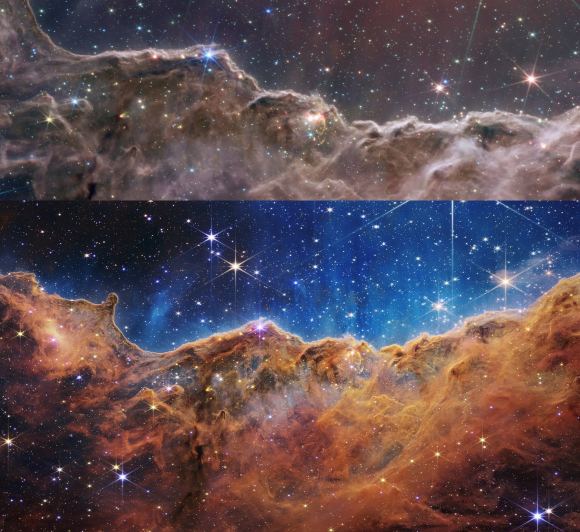 The “Cosmic Cliffs” feature in the Carina Nebula, as imaged by Hubble (top) and the JWST (bottom). Credit: NASA/ESA/CSA/STScI