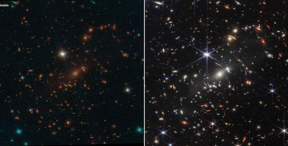 Deep Field Galaxy cluster SMACS J0723.3-7327, imaged by Hubble (left) and the JWST (right). Credit: NASA/ESA/CSA/STScI