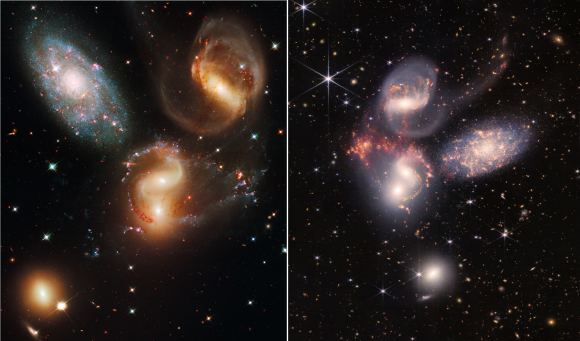 Stephan’s Quintet, as imaged by Hubble (left) and the JWST (right). Credit: NASA/ESA/CSA/STScI