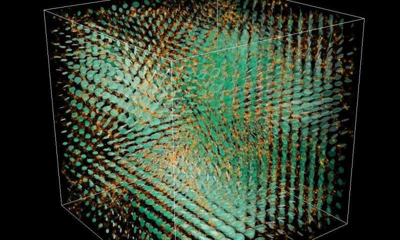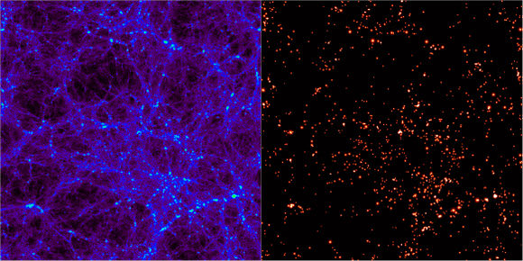 A computer simulation of the distribution of matter in the universe. Orange regions host galaxies; blue structures are gas and dark matter. Credit: TNG Collaboration