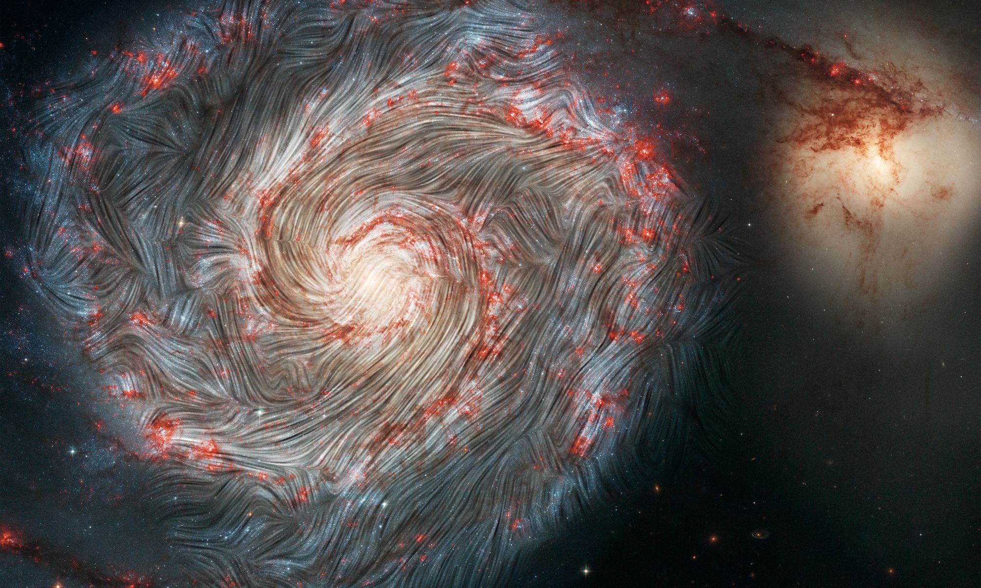 Magnetic fields mapped within the Whirlpool Galaxy. Credit: NASA, SOFIA science team, ESA, STScI