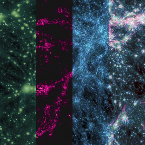 Three different observations of the cosmic web (gas, radio, and magnetic) accompanied by a composite image. Credit: K. Brown